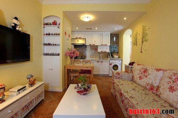 本案所示是安徽省合肥市天一大厦————天天公寓46平米一居室田园风格装修效果图,预算约为1万,工程类型为半包。此套设计的整体基调为米黄色,暖色调的总体协调使得整个案例彰显温馨舒适的居家美感格外强烈,与其它田园风格的装修案例不太一样的地方在于,此案例的色彩较为丰富多彩,在具体操作过程中,也使用了较多的手段进行整体气氛的掌控。设计师巧妙的运用了这些色彩的合理搭配,以及层次鲜明的格局划分,虽然只有一居室的空间,但是经过设计师周密布局,案例从效果上看来没有丝毫的拥挤和狭小,相反,更加让人觉得清新亮丽、自然可爱。开放式厨房的打造,充分的利用了空间。碎花布艺沙发配合复古砖和黄色的墙面,暖间将整个田园风情的气质表现的淋漓尽致。